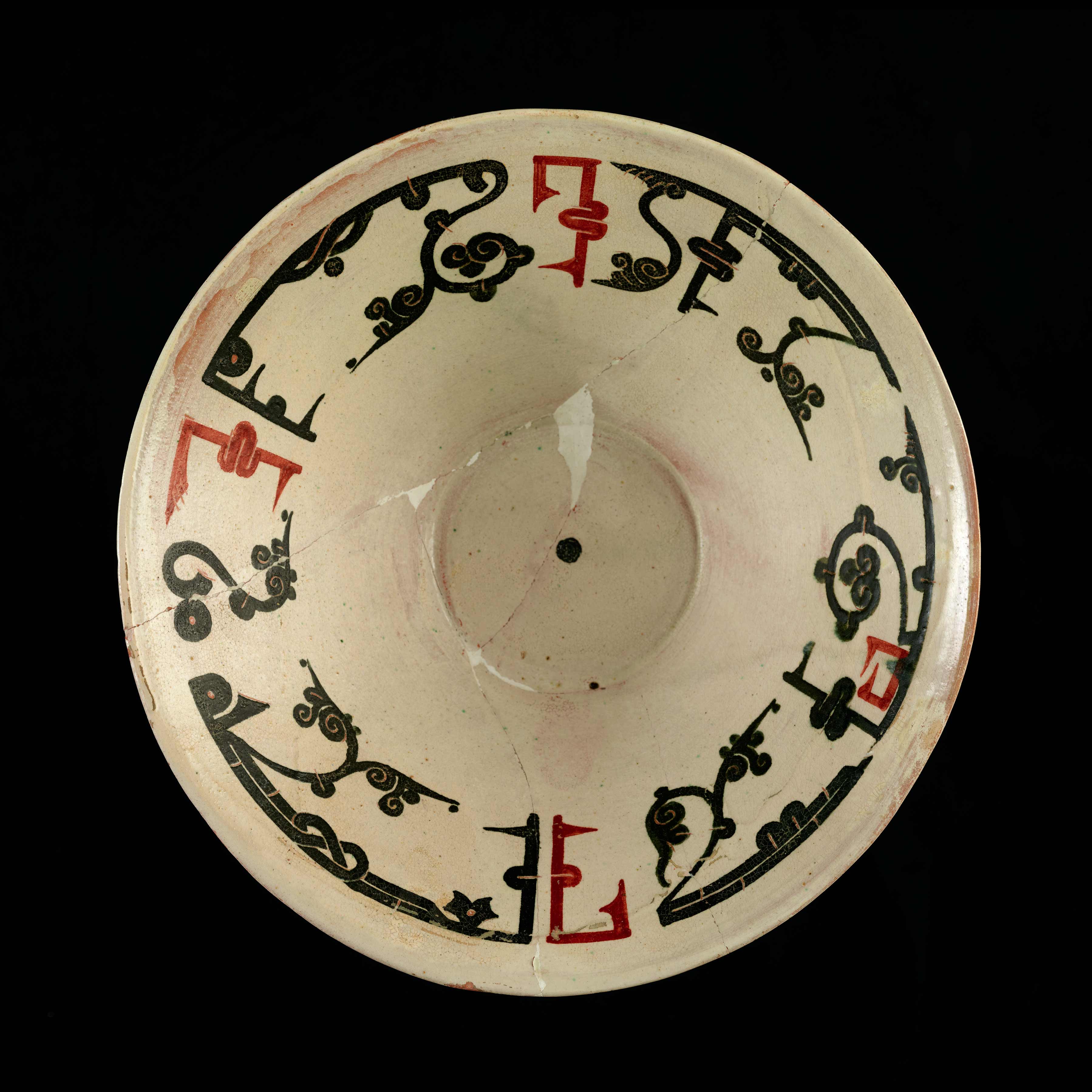 Earthenware, white slip with black and red slip decoration under a transparent glaze