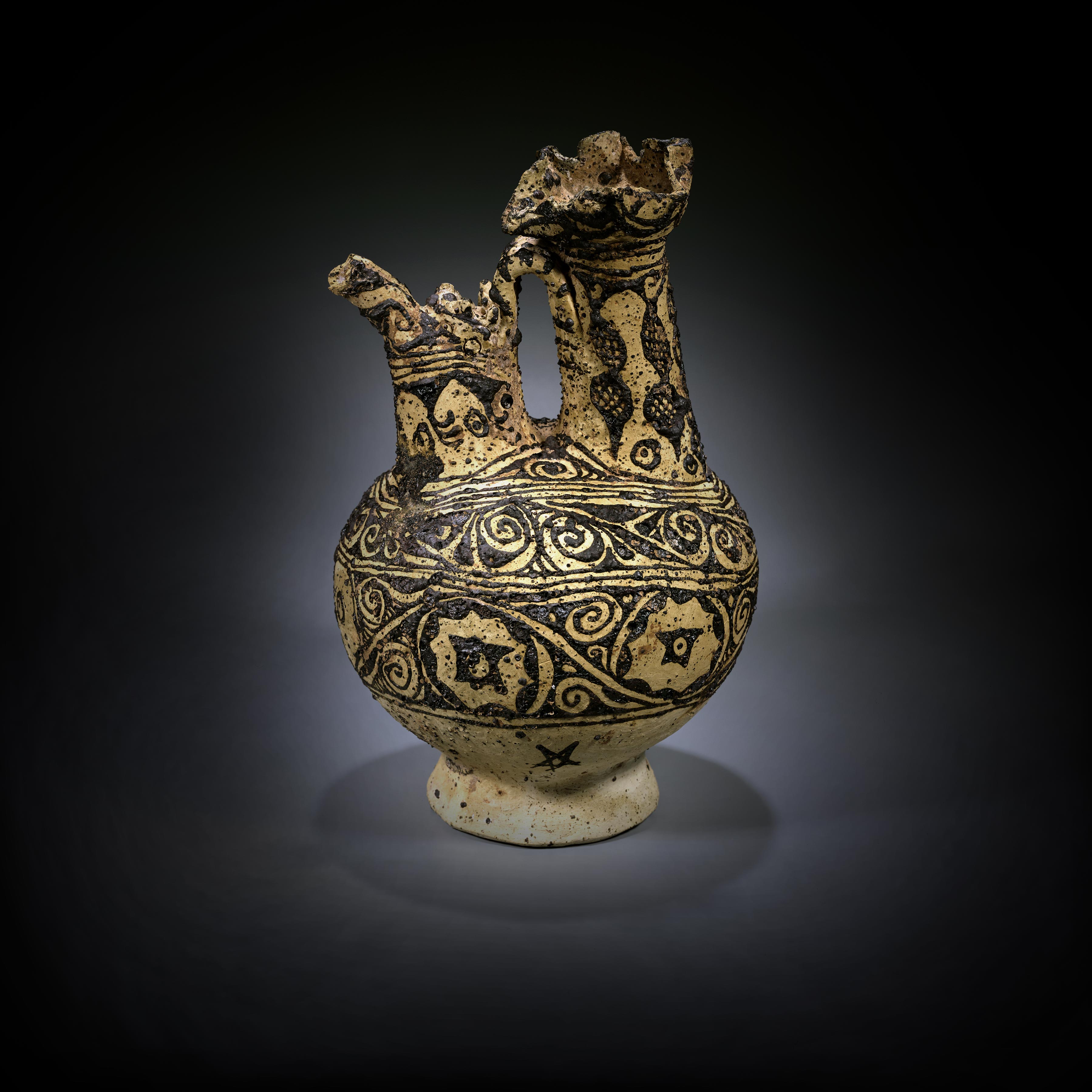 Earthenware, cream slip in places, painted with a thick layer of vitrified black-quartz-glaze Iranian World, 8th - 10th Century Height 25.8 cm, Base 8.5 cm
