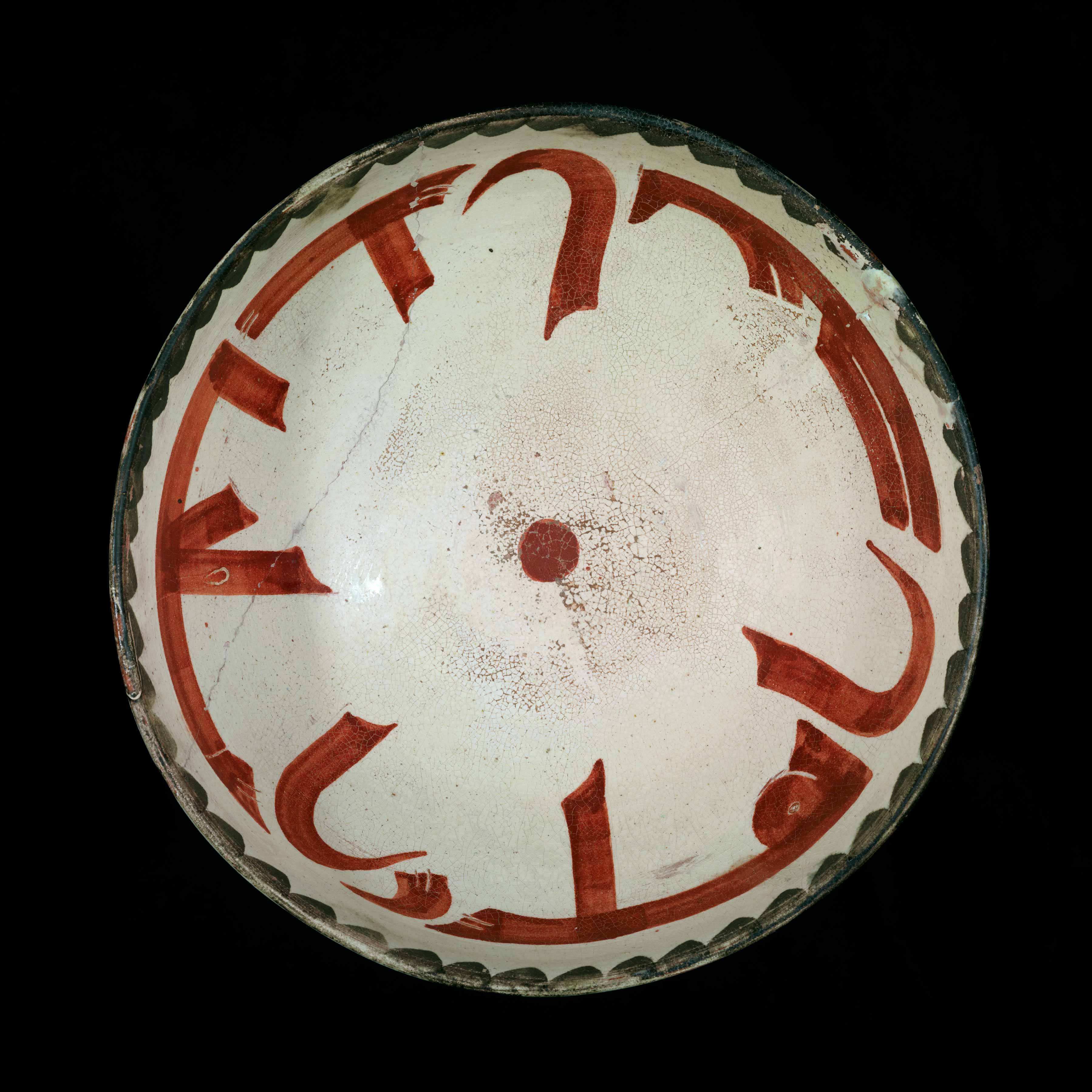 Earthenware, white slip with red slip decoration under a colourless glaze Eastern Iranian World, Transoxiana, probably Samarkand or Nishapur, 10th – 11th century AD Rim 23 cm, Height 9.1 cm, Base 10.3 cm