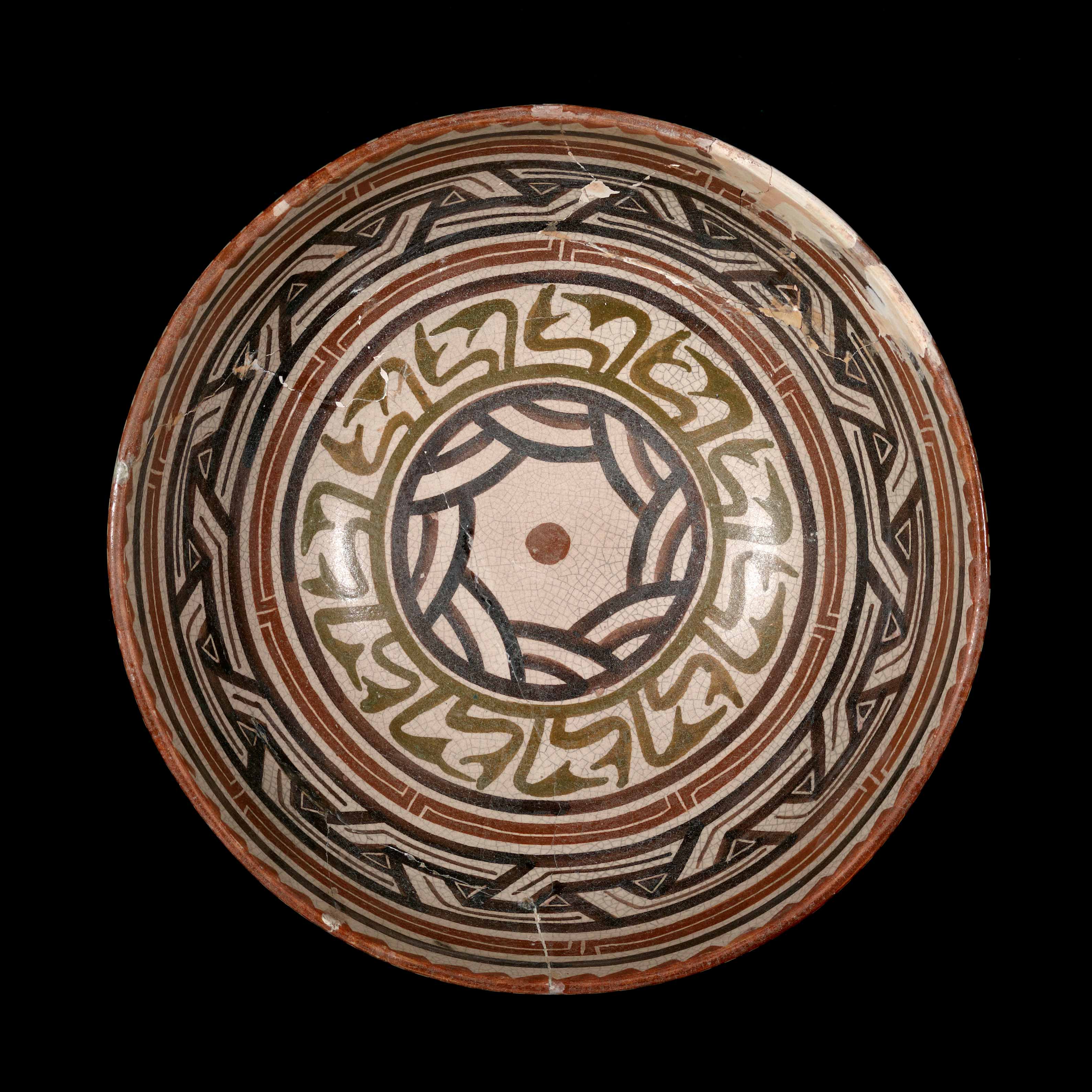 Earthenware, cream slip with dark brown, olive green, and russet slip