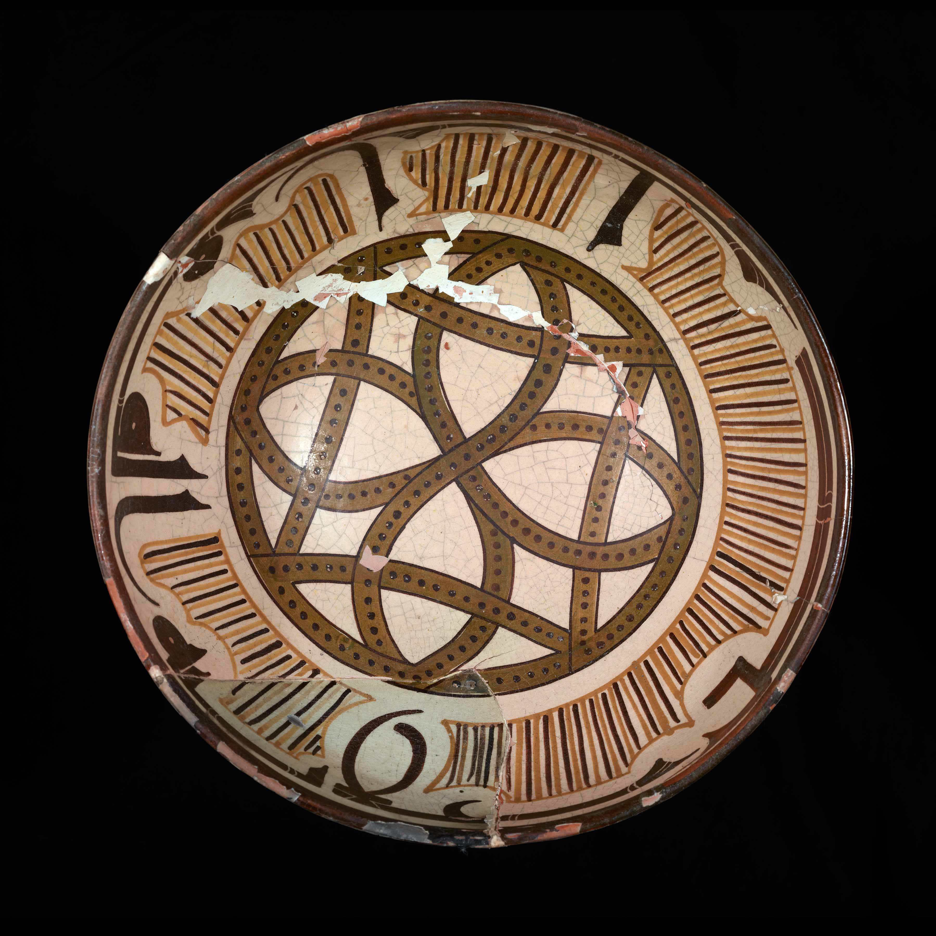 Earthenware, cream slip decorated in golden brown, dark brown, golden-yellow to ochre coloured slip under a colourless glaze