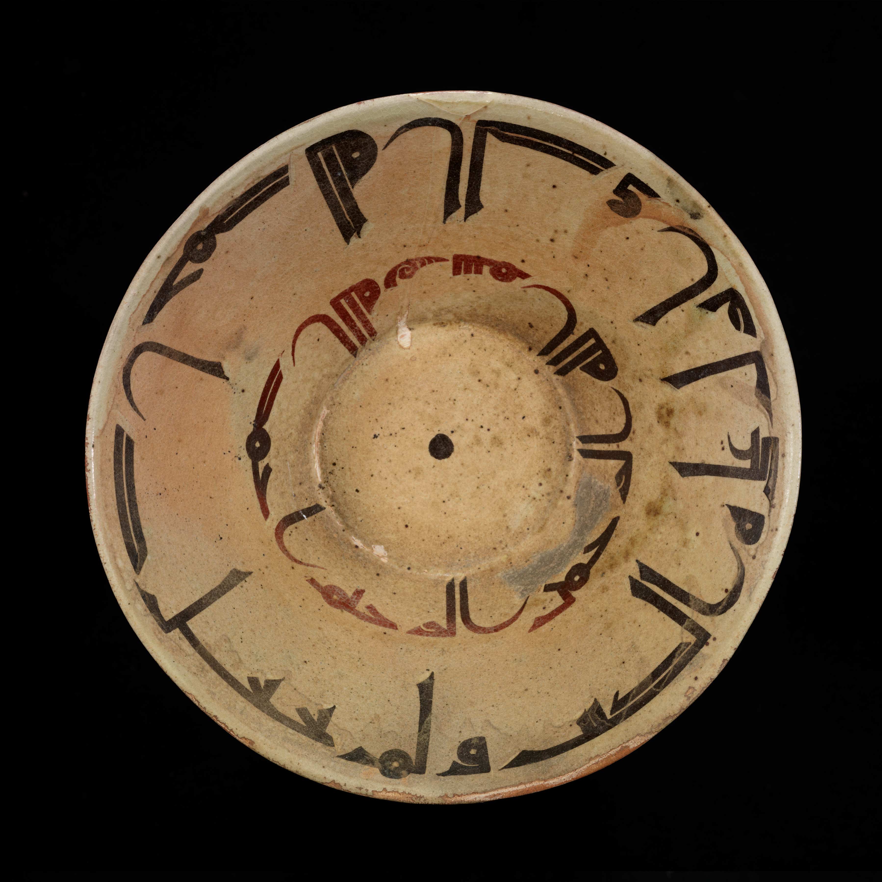 Earthenware, cream slip with brown and red slip decoration under a (now much deteriorated) transparent glaze