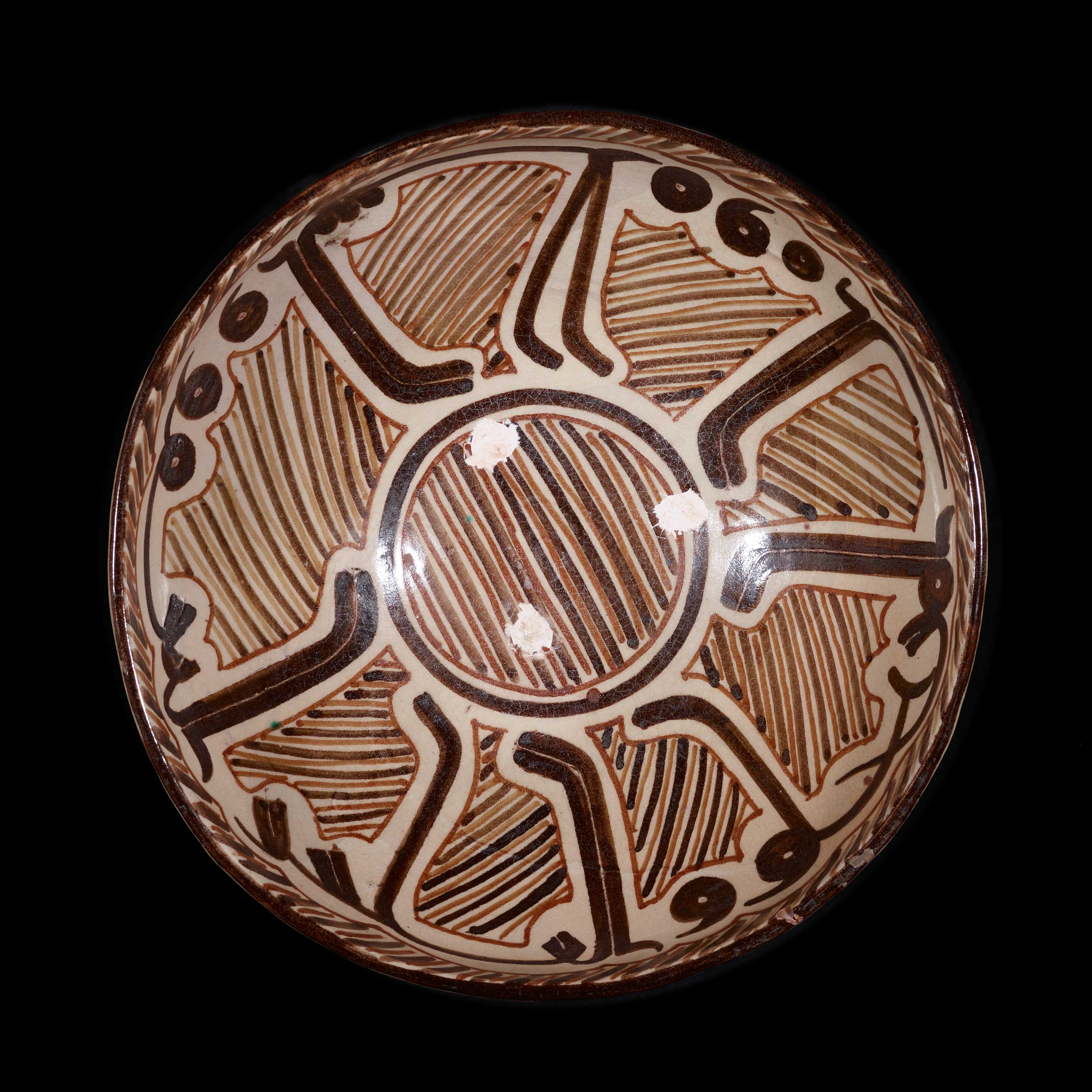 Earthenware, cream slip with dark brown and red slip decoration under a transparent glaze