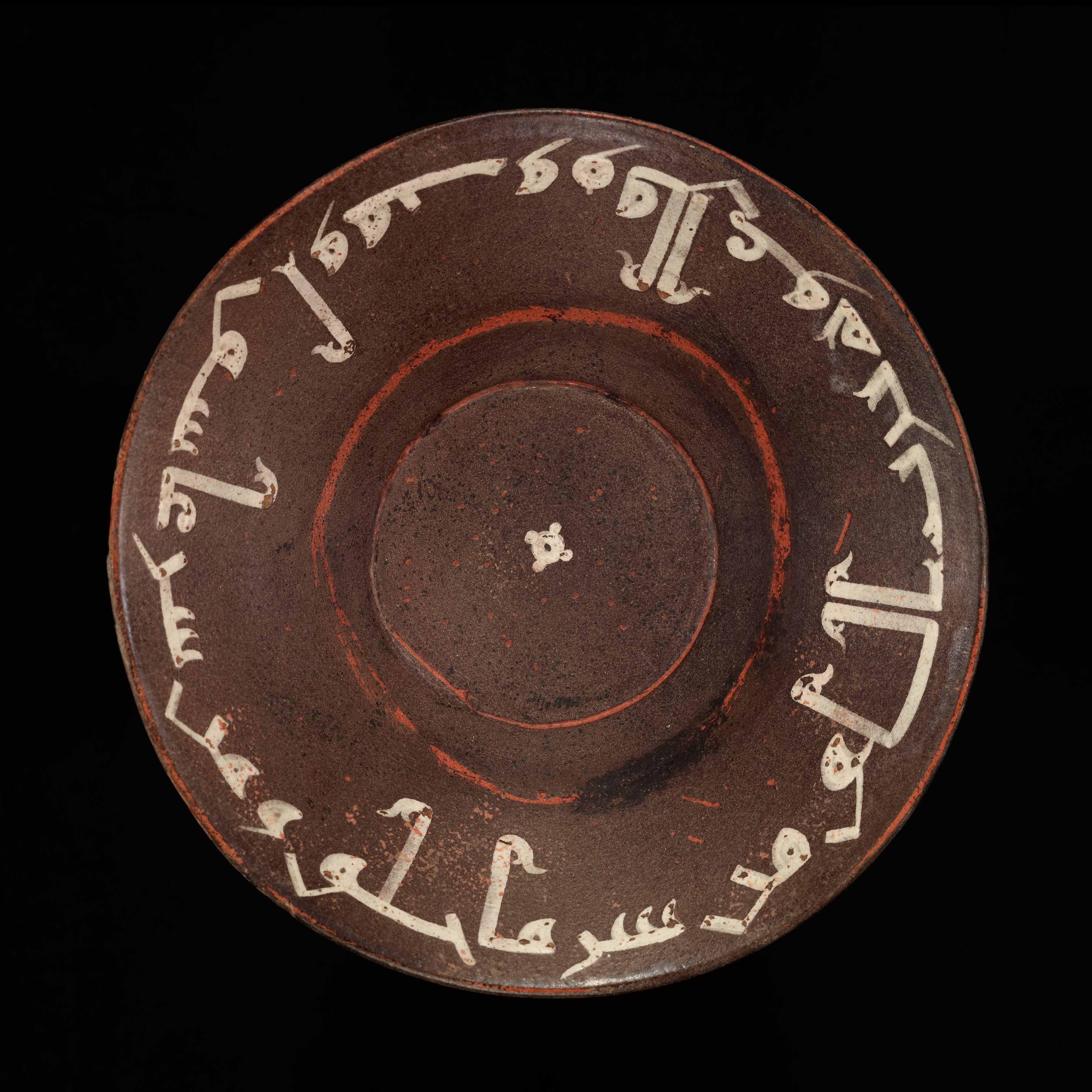 Earthenware, cream slip with dark brown and red slip decoration under a transparent glaze Eastern Iranian World, Khorasan, probably Nishapur, 11th century AD Rim 23.4 cm, Height 7.7 cm, Base 9.1 cm