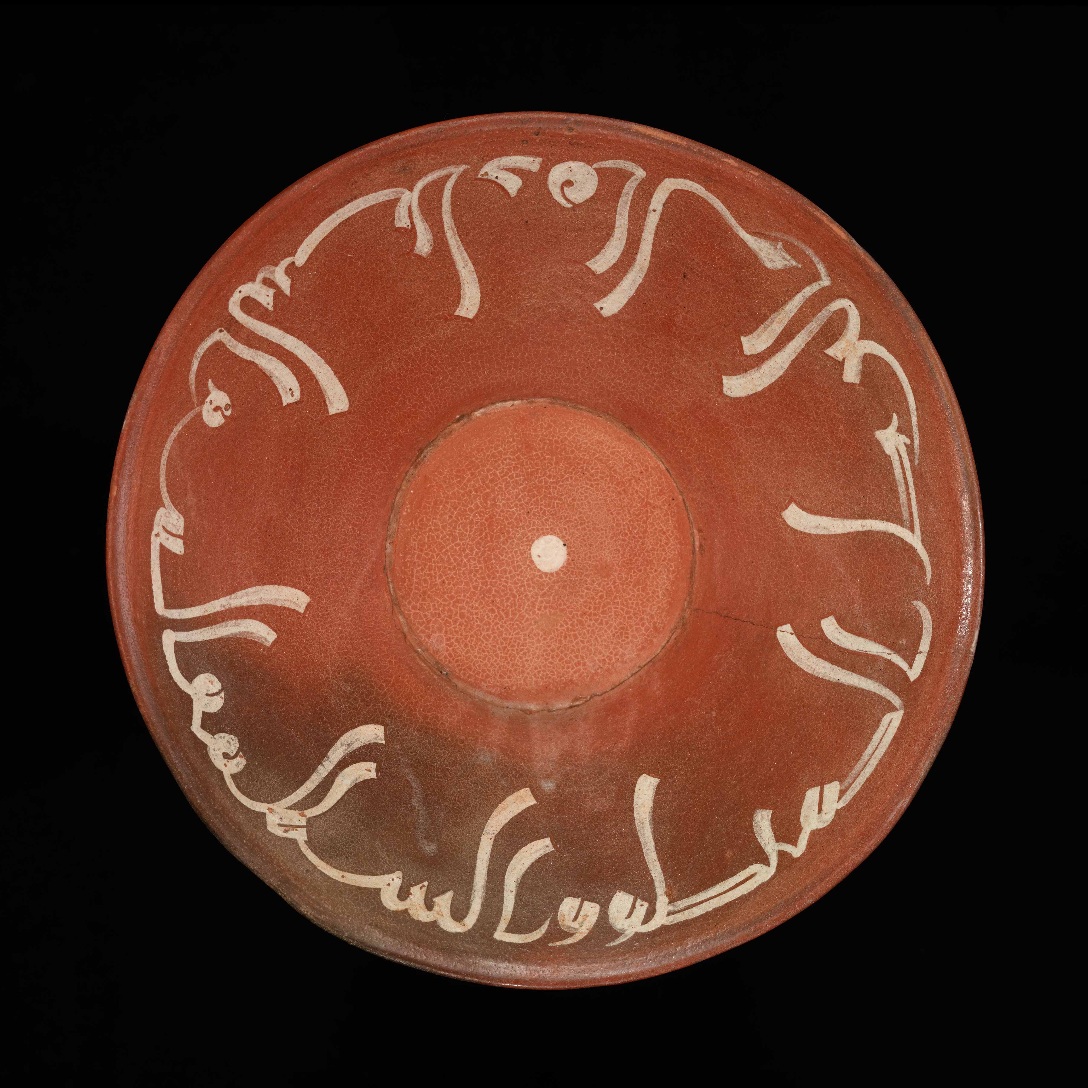 Earthenware, red slip with white slip decoration under a colourless glaze Eastern Iranian World, Khorasan, probably Nishapur, 11th century AD Rim 24 cm, Height 7.7 cm, Base 9.8 cm