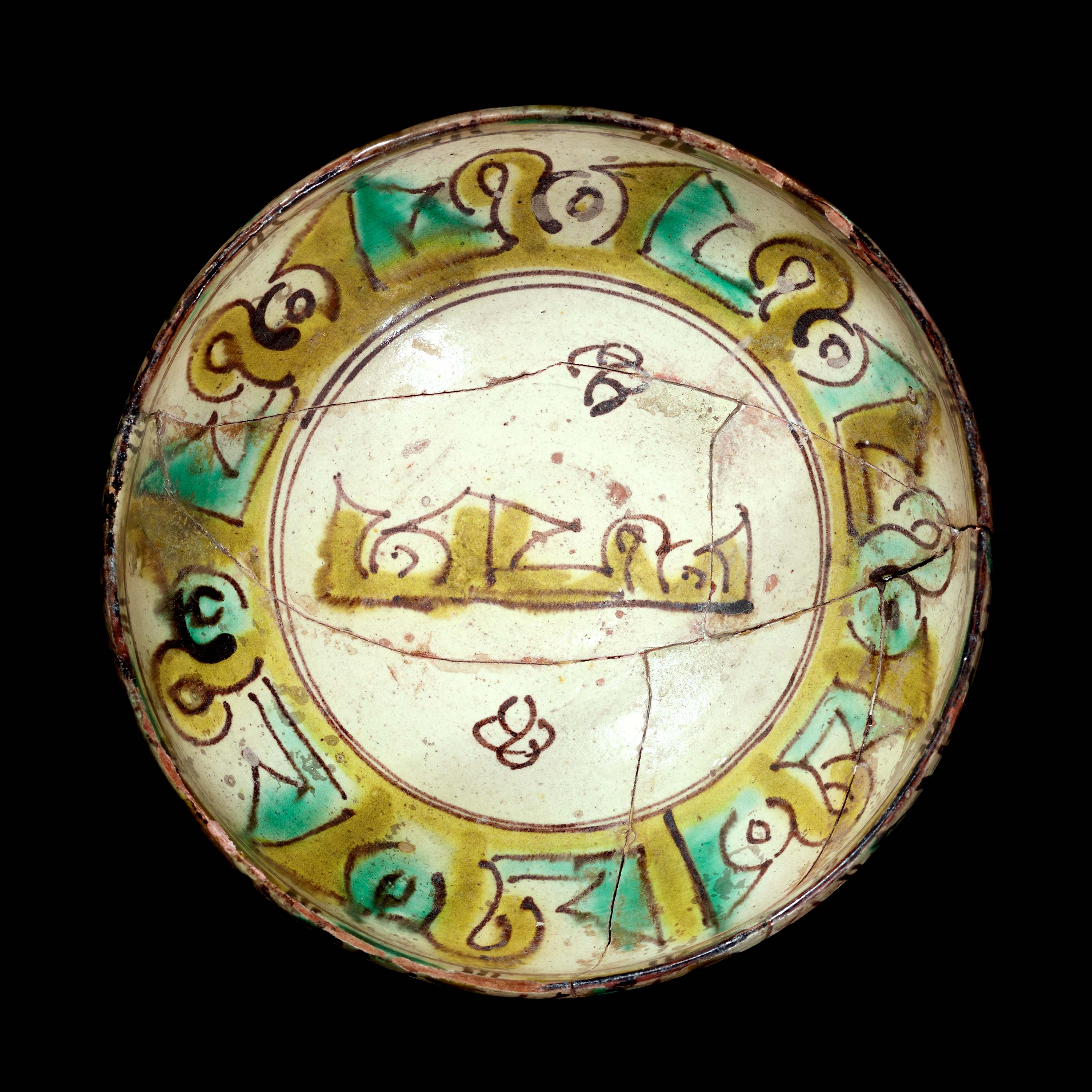 Earthenware, cream slip decorated in black, yellowish olive and light green under a transparent glaze