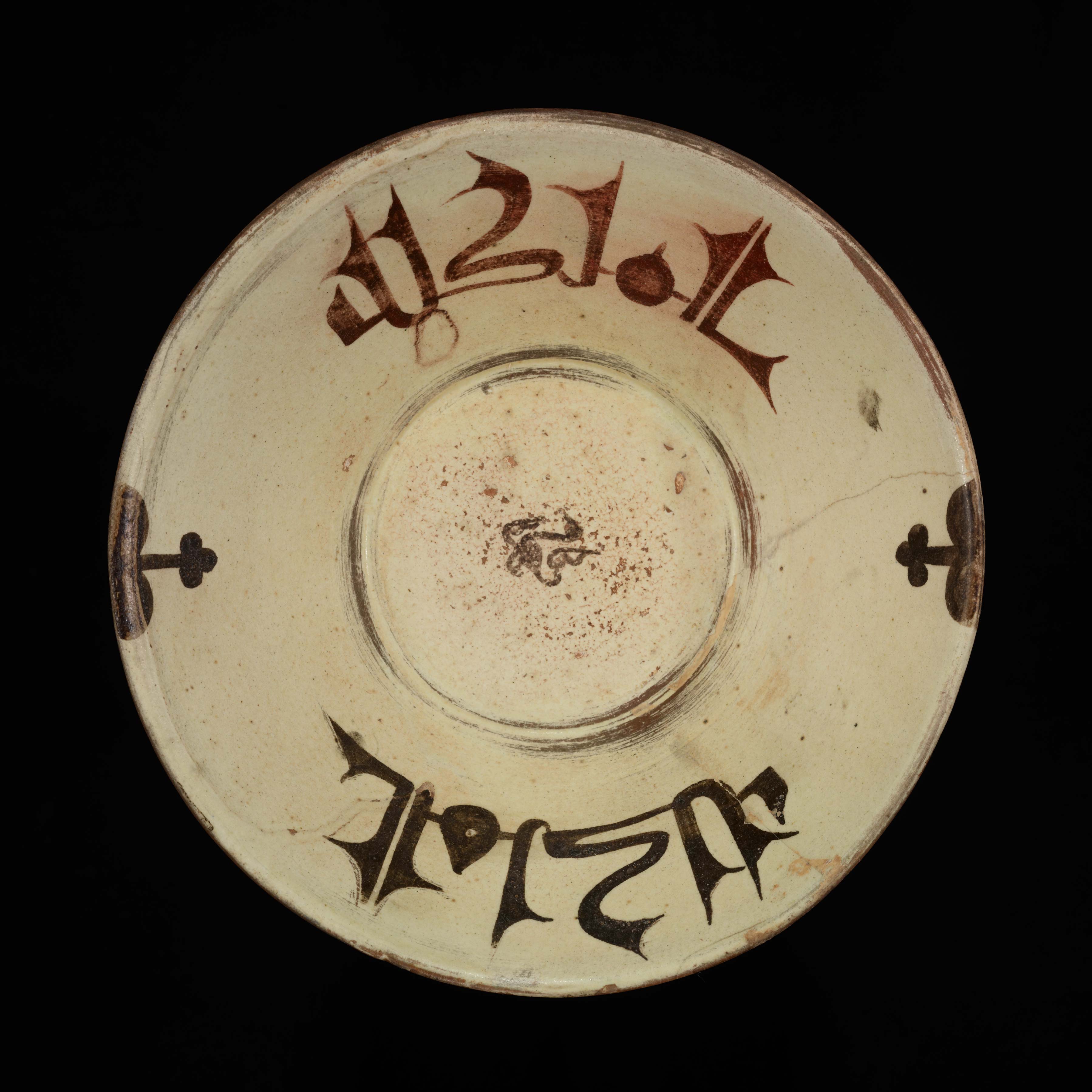 Earthenware, white slip with black and brown slip decoration under a transparent glaze Eastern Iranian World, Khorasan, possibly Nishapur, 10th century AD Rim 21.2 cm, Height 7 cm, Base 7.7 cm